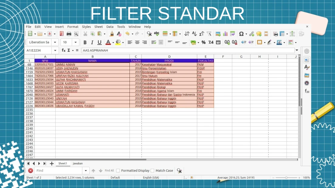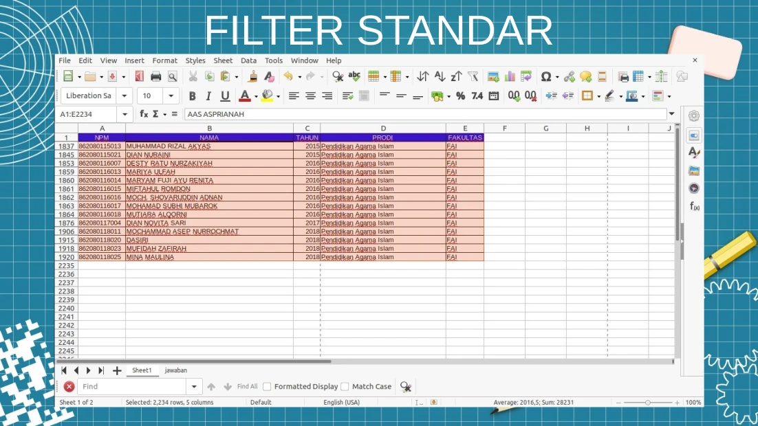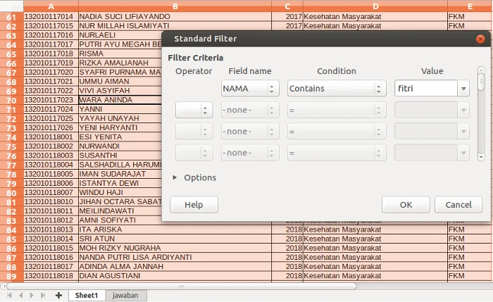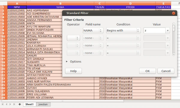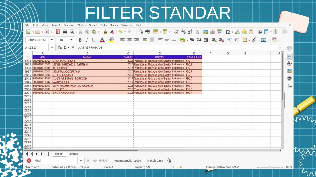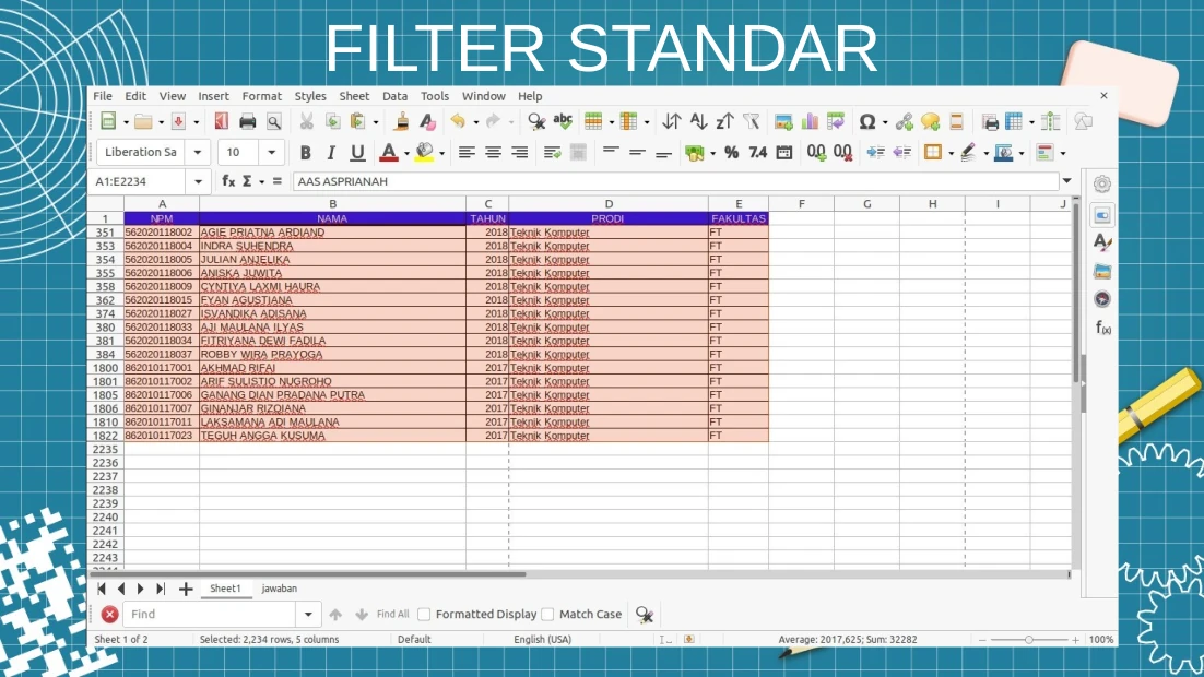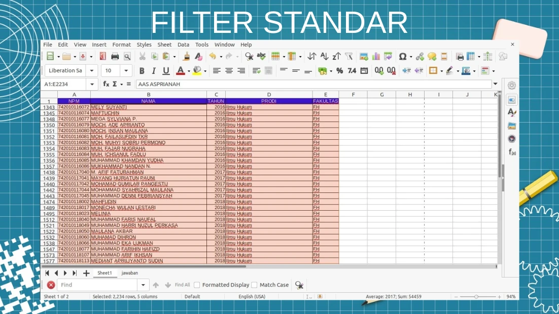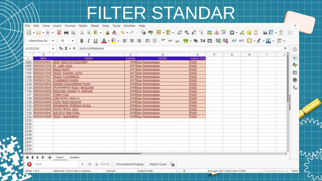 Filter standar digunakan untuk menampilkan informasi yang berasal dari suatu gugus data berukuran relatif besar, berdasarkan kriteria tertentu. Dalam latihan ini digunakan basisdata mahasiswa Universitas Wiralodra tahun masuk 2015-2018 (4 angkatan) yang terdiri dari 2233 mahasiswa. Untuk itu download file filter-standar, buka file tersebut, dan ikuti uraian berikut ini.