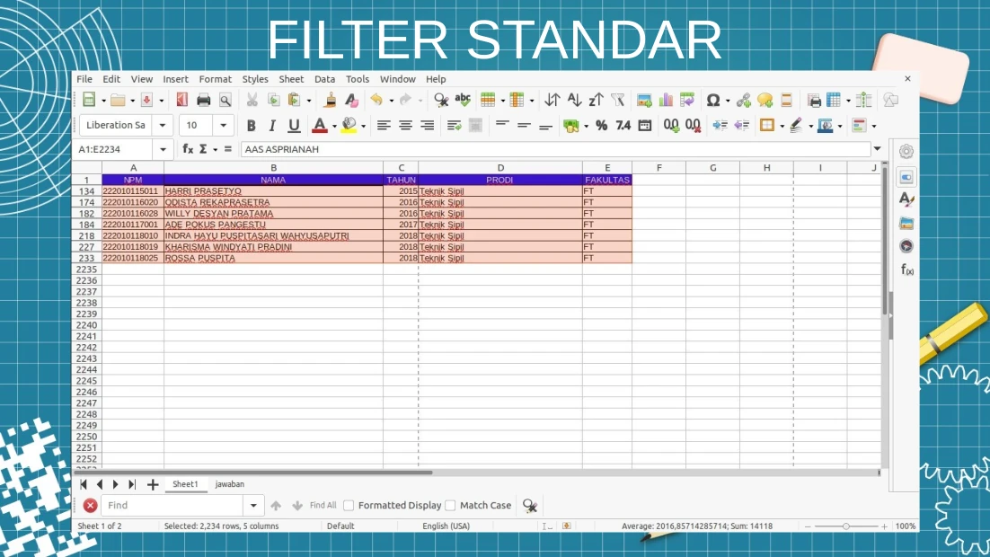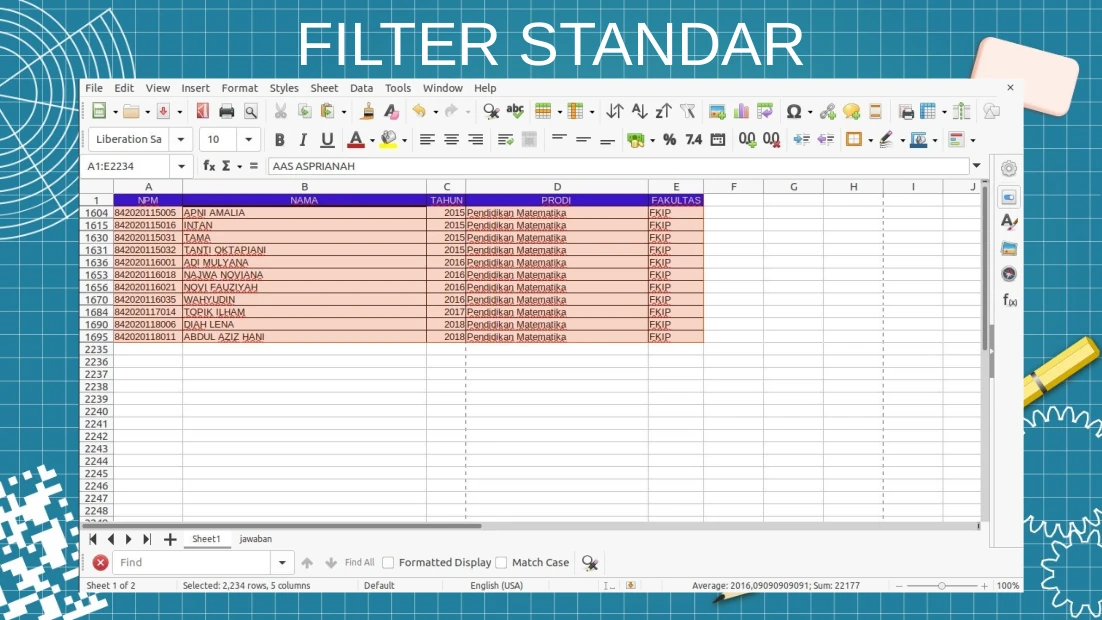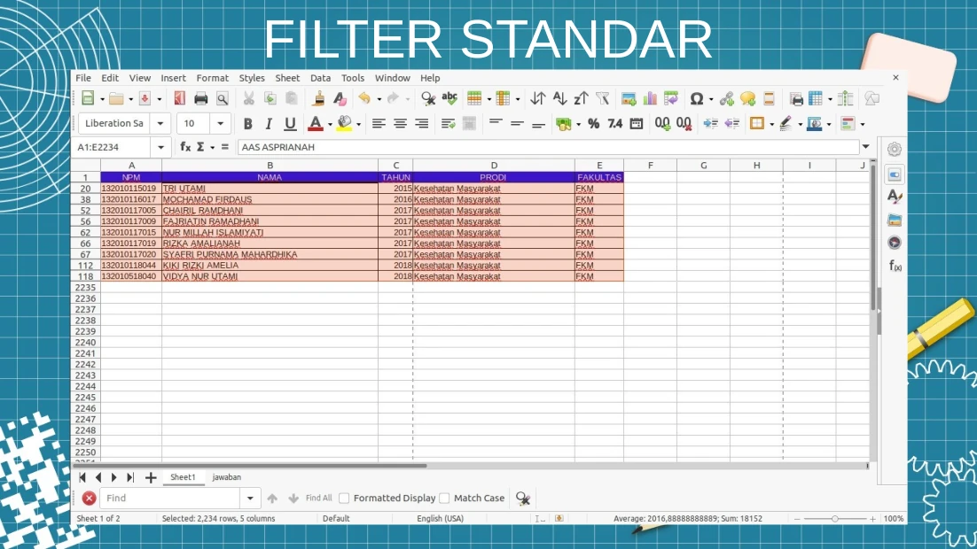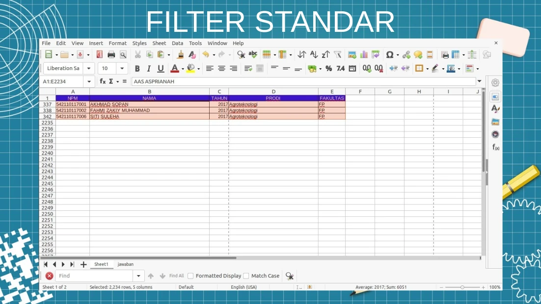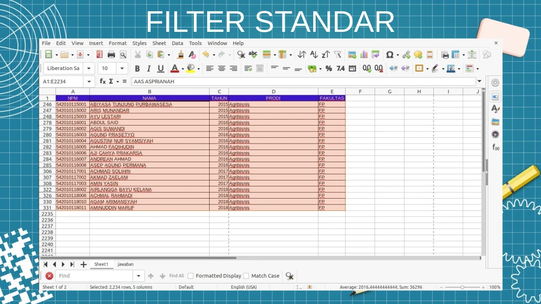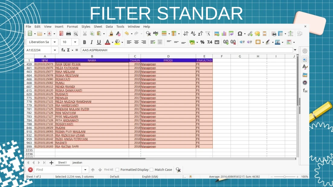 Filter standar digunakan untuk menampilkan informasi yang berasal dari suatu gugus data berukuran relatif besar, berdasarkan kriteria tertentu. Dalam latihan ini digunakan basisdata mahasiswa Universitas Wiralodra tahun masuk 2015-2018 (4 angkatan) yang terdiri dari 2233 mahasiswa. Untuk itu download file filter-standar, buka file tersebut, dan ikuti uraian berikut ini.