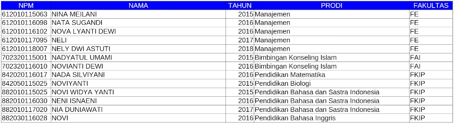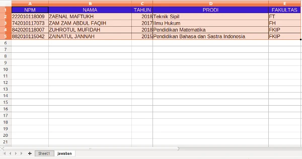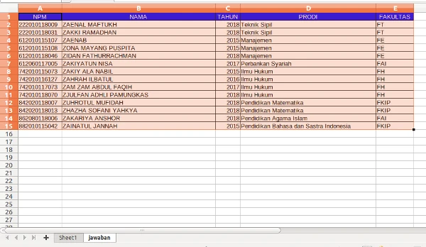 (dalam latihan ini, judul kolomnya adalah NPM, NAMA, TAHUN, PRODI, FAKULTAS) - Condition: