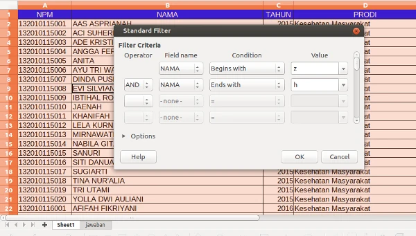 - Jalankan Filter Standar dan gunakan kriteria filter sesuai dengan pemahanan pada langkah pertama.