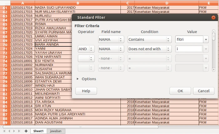 - Perhatikan bahwa output yang dihasilkan filter standar tahap pertama berisi 46 nama mahasiswa yang memiliki unsur nama FITRI, sedangkan output yang diminta hanya berisi 15 nama mahasiswa yang memiliki unsur nama FITRI. Kelebihan ini terjadi karena adanya beberapa nama yang diakhiri huruf I. Untuk membuang kelebihan tersebut, gunakan filter standar tahap kedua seperti terlihat pada gambar di bawah ini.