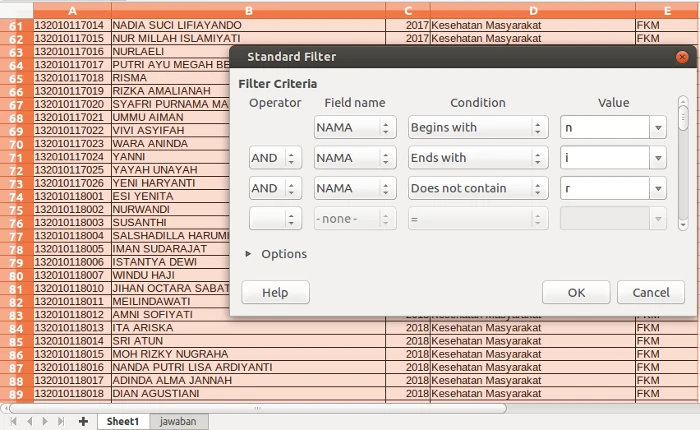 - Perhatikan bahwa output yang dihasilkan filter standar tahap pertama berisi 55 mahasiswa yang namanya berawalan N dan berakhiran I, sedangkan output yang diminta hanya berisi 13 mahasiswa yang namanya berawalan N dan berakhiran I. Kelebihan ini terjadi karena adanya beberapa nama yang mengandung huruf R. Untuk membuang kelebihan tersebut, jalankan filter standar tahap kedua seperti terlihat pada gambar di bawah ini.